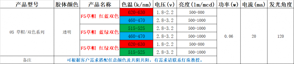 4、5mm草帽灯珠双色有F5mm草帽红蓝双色,F5mm草帽蓝绿双色和F5mm草帽红绿双色。