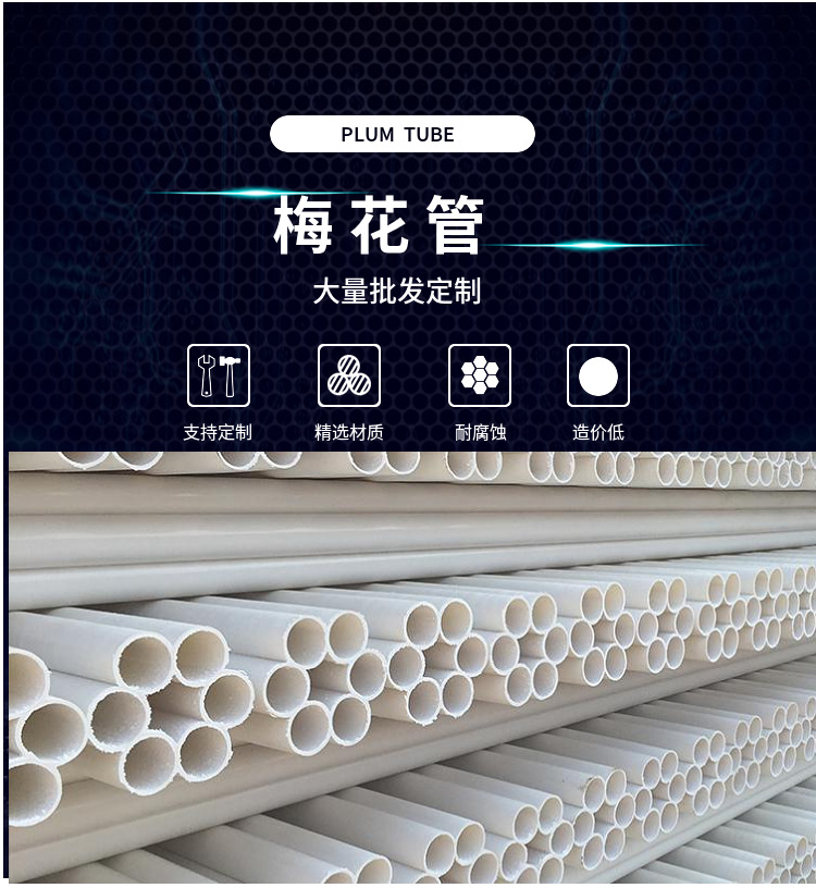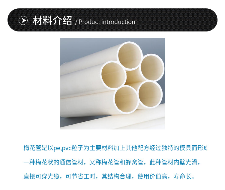 梅花管是以pvc粒子为主要材料加上其他配方经过独特的模具而形成的一种梅花状的通信管材,又称梅花管和蜂窝管,此种管材内壁光滑,直接可穿光缆,可节省工时,其结构合理,使用价值高,寿命长 。