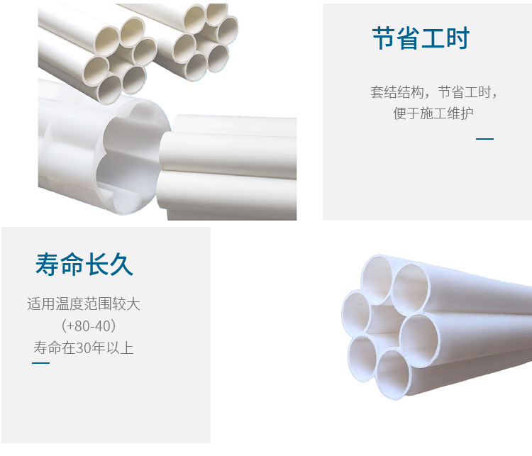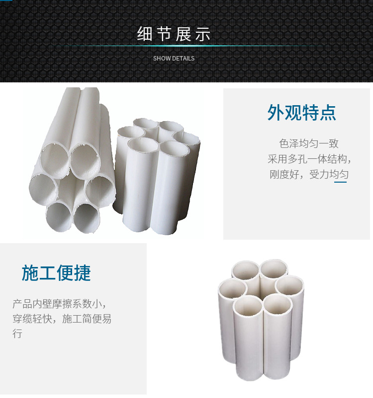 梅花管采用多孔bai一体结构,du刚度好,受力均匀。产品zhi内壁摩擦系数dao小,穿缆轻快,施工简zhuan便易行。具有shu多个孔位,可预留管孔,提高通信孔位利用率。产品适用温度范围较大(+80-40),在热带及寒冷地区均可使用。接头采用套接结构。毋需任何工具即可完成管子之间连接,便于施工和维护。梅花管使用寿命在埋深条件下大于30年以上。