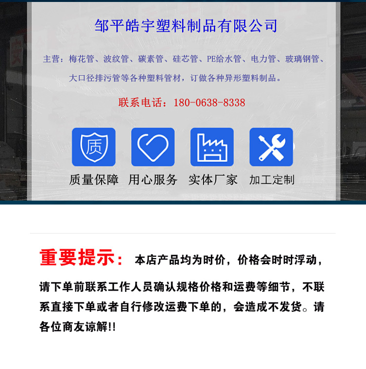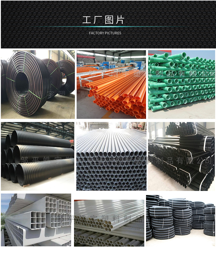 邹平皓宇塑料制品有限公司主要生产:梅花管、波纹管、碳素管、硅芯管、PE给水管、电力管、玻璃钢管、大口径排污管等各种塑料管材,订做各种异形塑料制品。自公司成立以来积累了丰富的实践经验,不断研制开发新产品,产品远销全国几十个省市和地区。公司以的服务、良好的信誉,为用户提供过硬的产品。