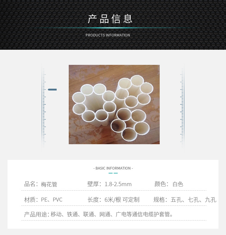 梅花管主要用于移动、铁通、联通、网通、广电等通信电缆护套管。