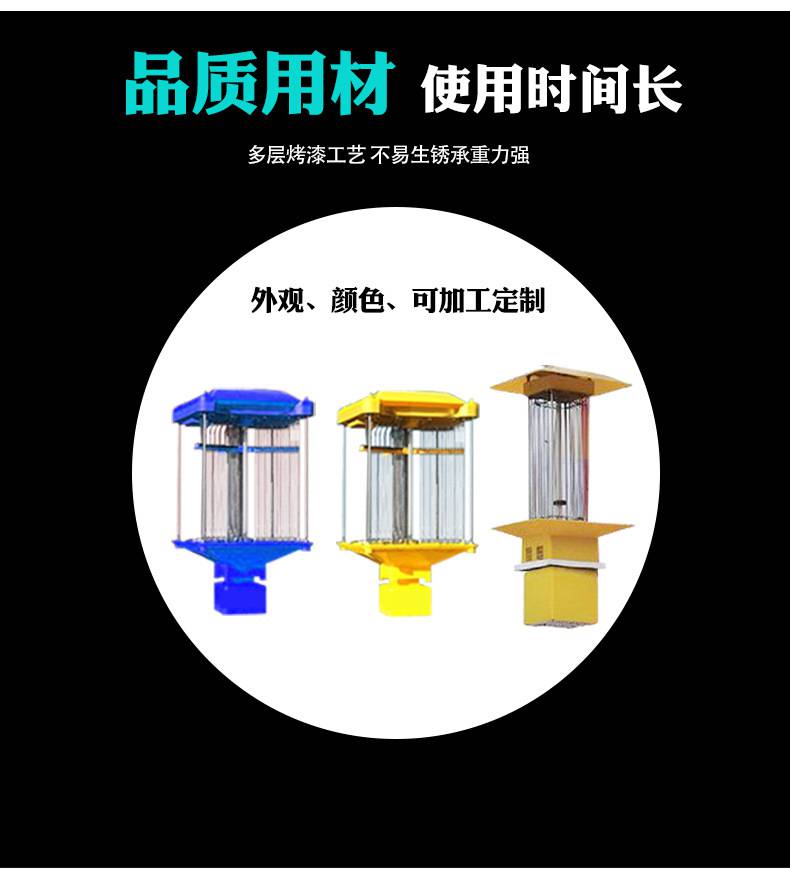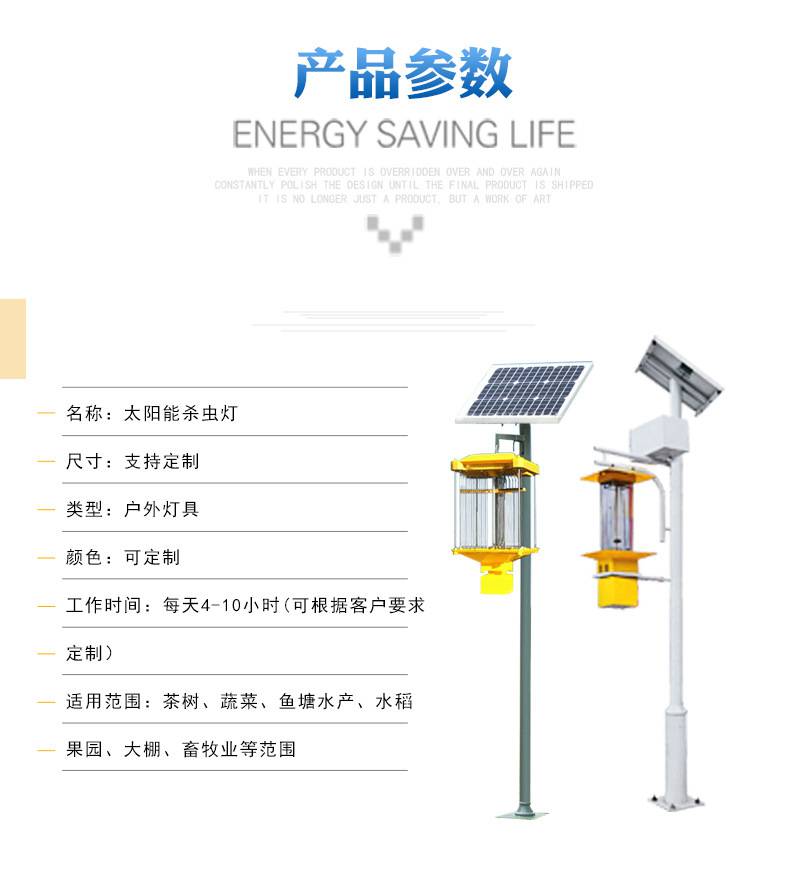 太阳能杀虫灯以太阳光为能源,白天充电晚上使用,智能光控时控,无需布线免电费,绿色节能无污染,可应用于户外、稻田、果园、大棚、茶树、鱼塘水产、畜牧业等,应用范围广泛,款式多样。