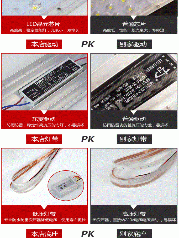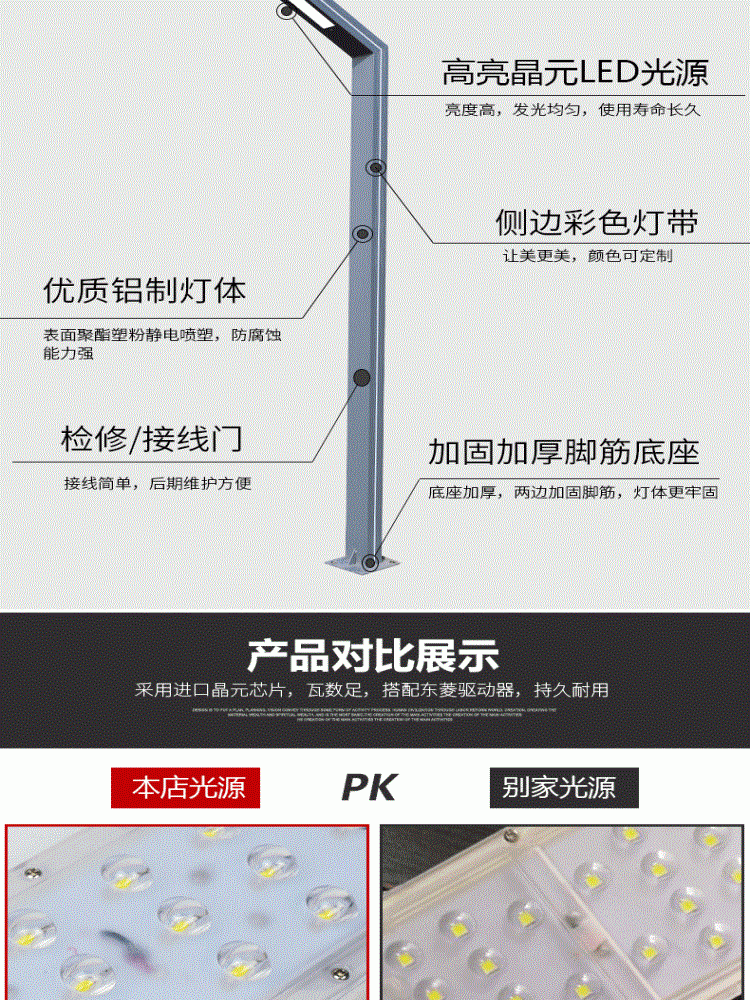 产品特点:高亮晶元LED光源、铝制灯体、进口晶元芯片、侧边彩色灯带、加固加厚脚筋底座