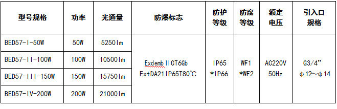● 按产品型号说明逐条选择,例需配用光源为LED灯100W,则产品型号为BED57-100W II;