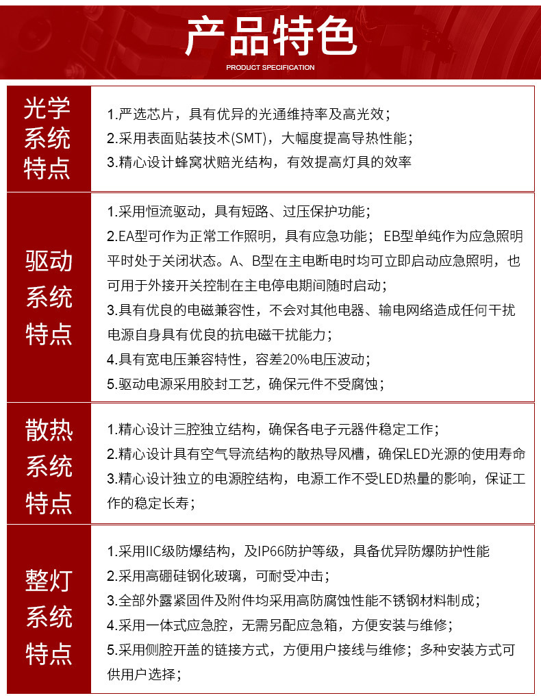 1、本产品外壳采用铝合金压铸成型,表面经高压静电喷塑处理;独立的电源腔结构,电源工作不受LED的热量影响,确保工作的稳定;透明件采用高硼硅钢化玻璃,可耐高能量冲击;