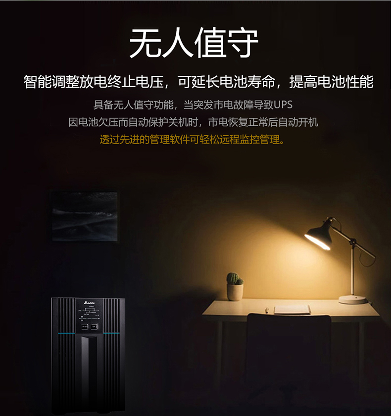 便捷监控管理:配备 LCD 面板与 LED 指示灯,可直观查看设备运行状态。标配 RS485、RS232、USB 通讯接口,还支持选配 SNMP 卡、干接点等配件,搭配 “电力管理大师” 监控软件 SMART2000,能实现 UPS 近程及网络远程监控,甚至远程开关机。