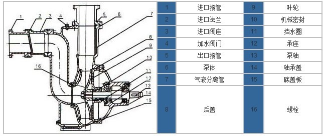 泵体内设有储液腔,并通过上方的回流孔和下方的循环孔与泵工作腔相通,构成泵的轴向加流外混式系统。泵停止工作后,泵内腔已储有一定容积的液体。当泵起动时,有关当局内的储液在叶轮的作用下,夹带着空气被向上抛出,液体通过气液分离管的网格回流到工作腔,气体被排出泵外,使泵内形成一定的真空度,达到自吸的作用。
