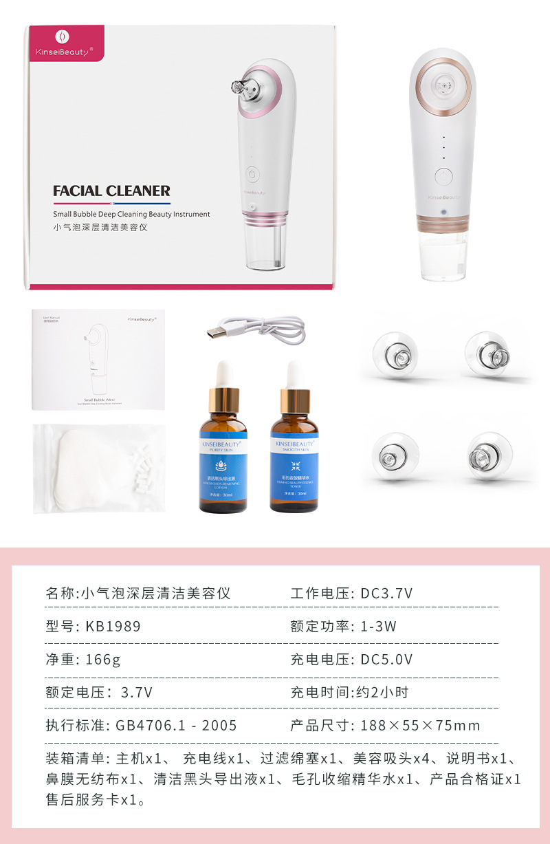 金赛美Kinseibeauty(KB1989)小气泡深层清洁美容仪琢木鸟仿生外观专利,3档吸力搭配4种可换吸头,满足不同部位黑头需求,水氧蓝光滋润护理,搭配舒缓精华液让您肌肤清洁紧致,容颜焕发。