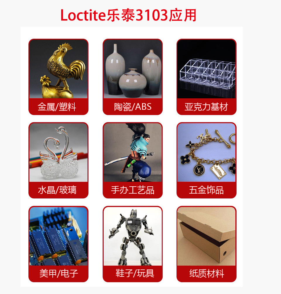 乐泰3103主要用于聚碳酸酯粘接,并且在典型的模压应力下不 会产生应力开裂. 3103在足够强度的UV或可见光照下快速固化 形成柔韧透明的胶层,该产品对大多数的基材,包括玻璃,许 多塑料和大多数金属表现出良好的粘接特性. LOCTITE®5182 ®的触变特性降低了液态产品在施胶到基材上后,