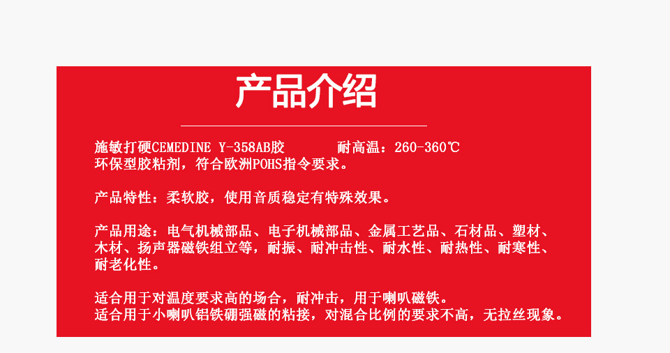 适合用于对温度要求较高的场合,耐冲击。用于喇叭磁铁,特别适合用于小喇叭铝铁硼强磁的粘接,对混合比例的要求不高,无拉丝现象。
