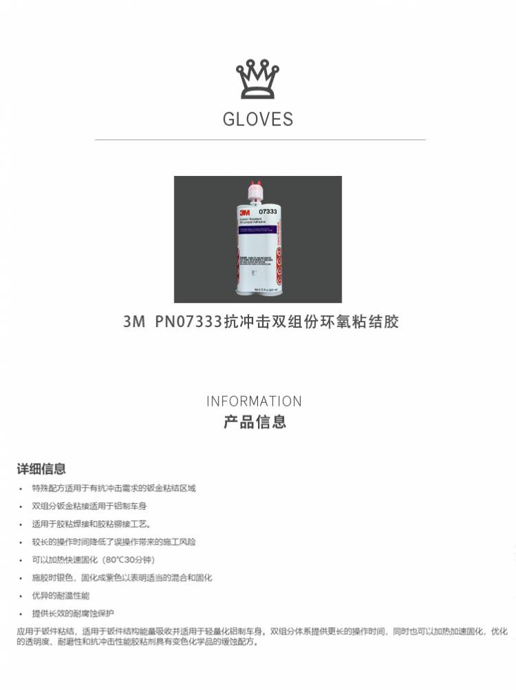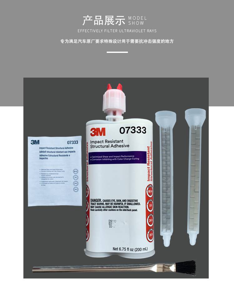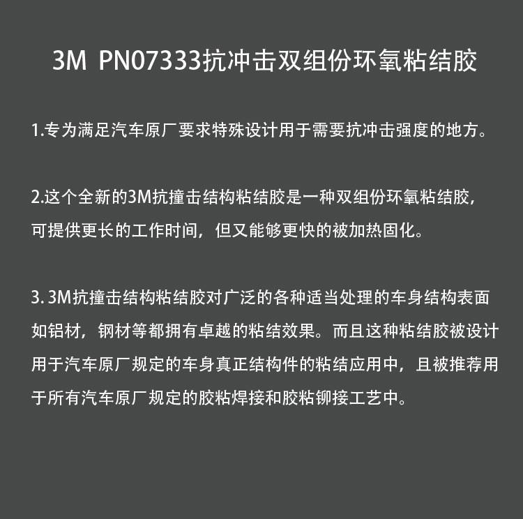 2、这个全新的3M抗撞击结构粘结胶是一种双组份环氧粘结胶,可提供长的工作时间,但又能够被加热固化,