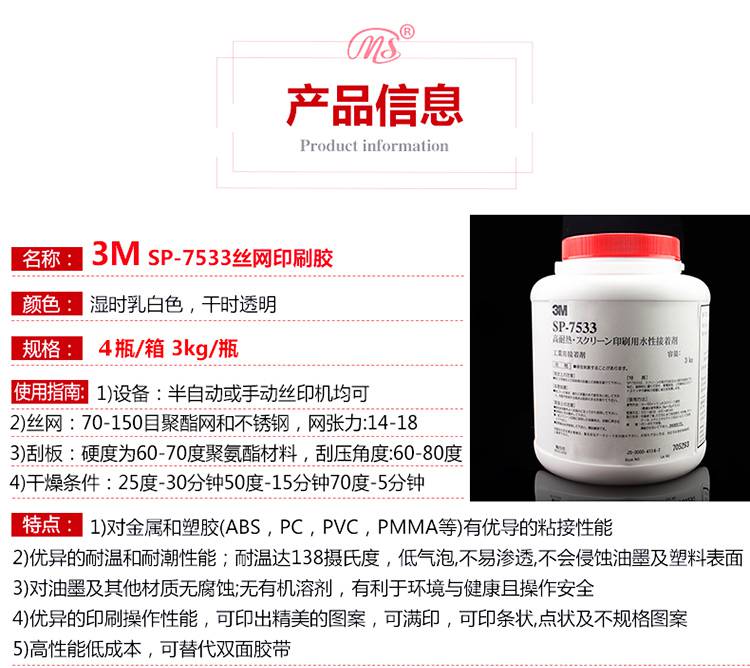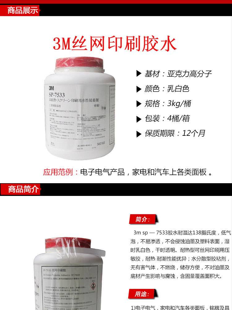 【产品介绍】:3M SP-7533胶水是耐热型可丝网印刷用压敏胶,耐热耐潮性能好;水分散型胶粘剂,储存方便;不对油墨及塑胶底材产生影响与腐蚀;含固量高覆盖面积大,该产品被广泛用于电子产品,家电及汽车业。