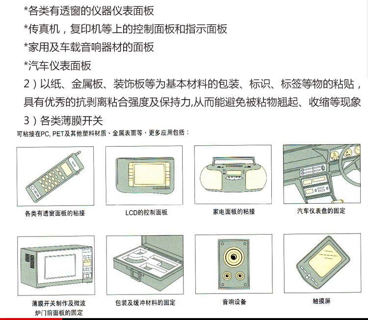 1)电子电气,家电和汽车各类面板,铭牌及具有透窗的面板和表面形状不规则面板的固定;