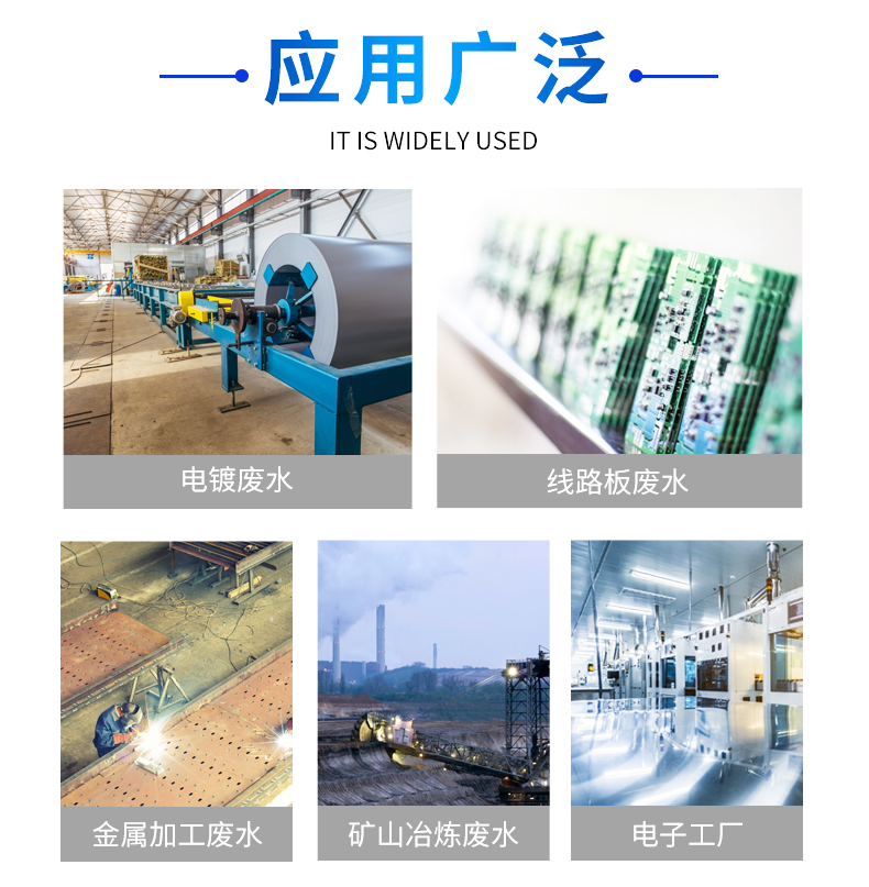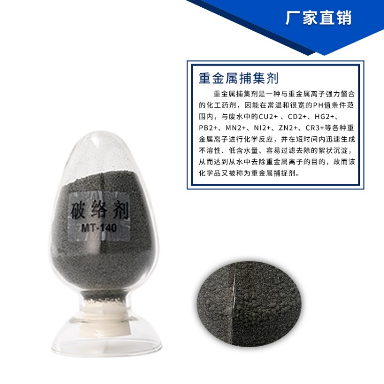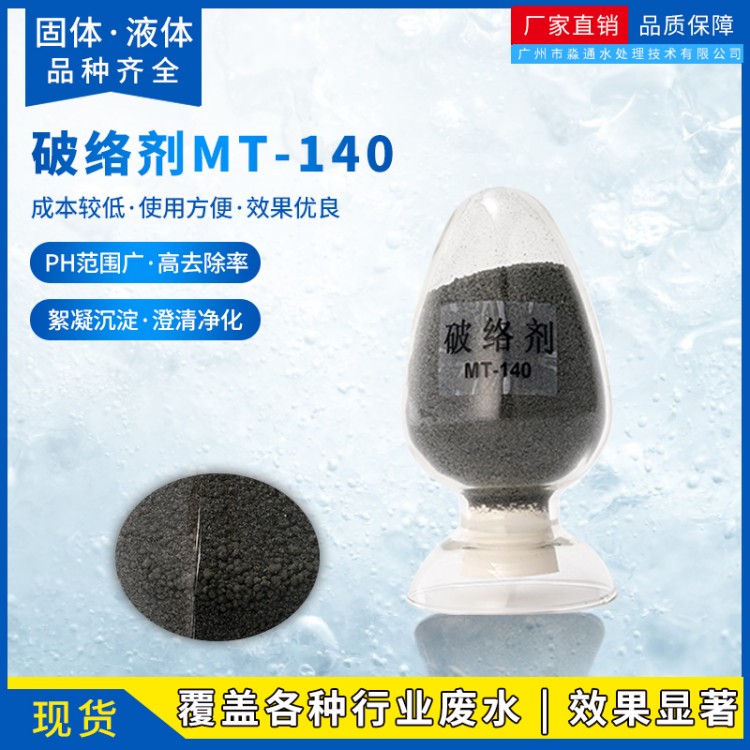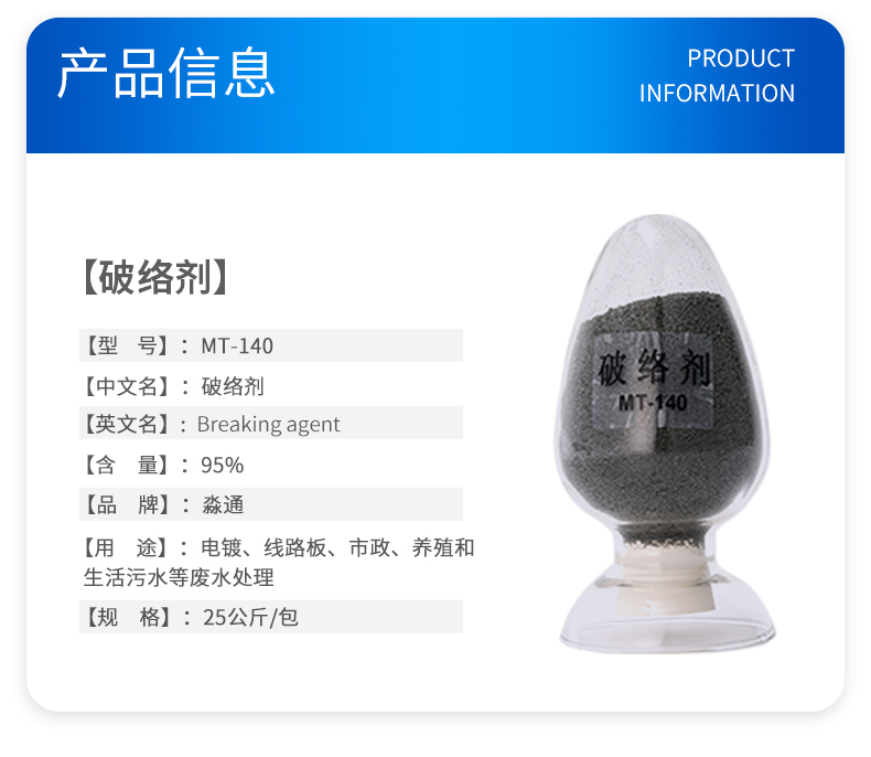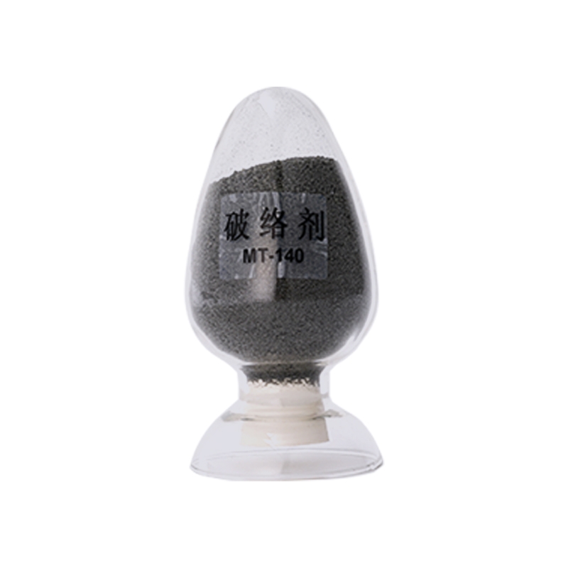 MT-140是一种高分子化合物,在酸性或中性条件下能破坏、柠檬酸、酒石酸、EDTA等络合物与重金属(如铜、镍、锌)形成的络合盐,使得重金属能够以氢氧化物的形式而沉淀,可用于电镀、线路板等重金属废水的处理。
