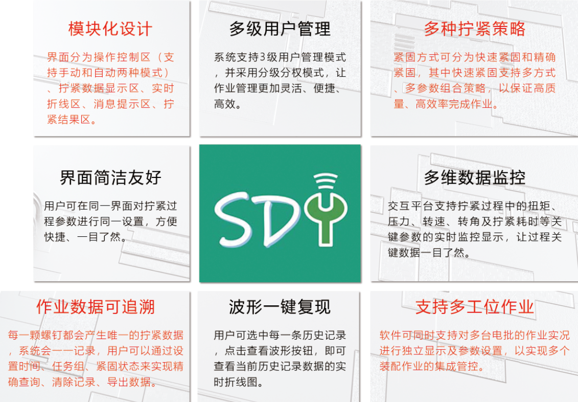 软件支持用户管理、拧紧参数设置,多任务组作业设置,拧紧结果信息提示,实时显示关键拧紧参数和拧紧过程曲线(同步显示拧紧扭矩及装配压力曲线),并支持历史数据的离线存储和一键导出。软件为公司完全自主开发,灵活开放,并支持与其他设备进行定制化集成与交互,将成为您在拧紧装配过程中的得力助手,帮助您快速实现制造业务数字化。