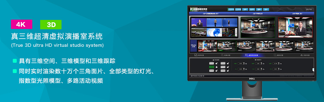 虚拟演播室系统采用无轨跟踪技术,内置色键抠像,一台设备可完成无轨跟踪、抠像、多镜头切换、图文包装等功能,虚拟演播室主要针对一些中小型节目或者行业用户,系统可支持2路摄像机信号输入,或者是不同角度的虚拟场景机位,完全满足演播室机位的切换要求,抠像效果细腻,边缘自然。