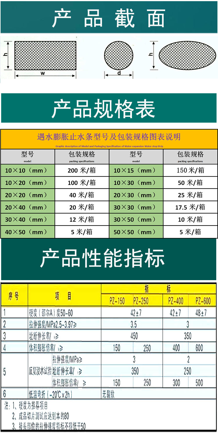 一、硫化型止水条,拉伸强度可达到≥3-3.5Mpa ;硬度(绍尔A)/度:42±7;体积膨胀率≥150%-250%;拉断伸长率≥450%。