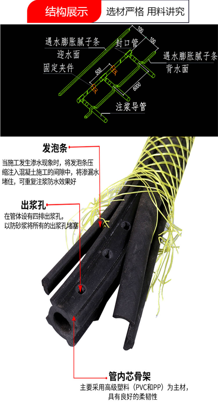 可重复注浆管,外径18,内径8,预埋式可维护注浆堵漏。可重复注浆管(亦称du多次性注浆管)管内芯骨架主要采用塑料(PVC和PP)为主材,具有良好的柔韧性。在管体上均匀的设有四排出浆孔和起单向开关作用的发泡条,起到全断面出浆的作用,以防砂浆将出浆孔堵塞。当施工缝发生渗水现象时,可及时进行注浆修补,带有压力的浆液会将发泡条压缩,并均匀地注入混凝土施工缝的间隙中,将渗漏水堵住。
