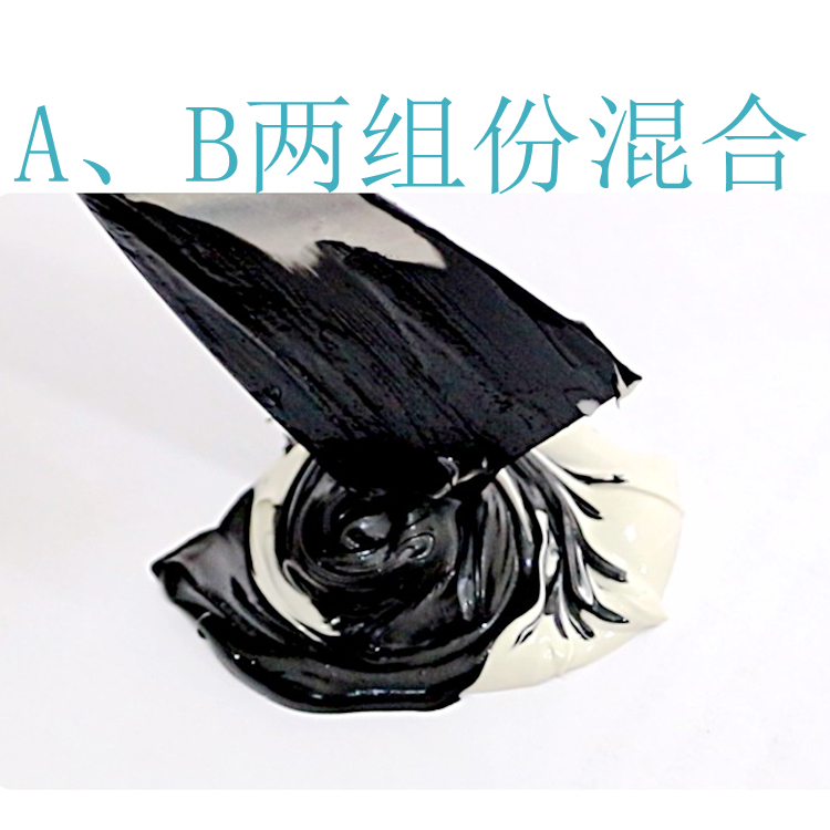 三、把箱内1桶白色聚硫胶(A组份)与1袋黑色固化剂(B组份)充分搅拌均匀,直到无色差为止。(注:因气候不同B组份应冬季多、夏季少)A:B=100:8-12,用前应先做小试。