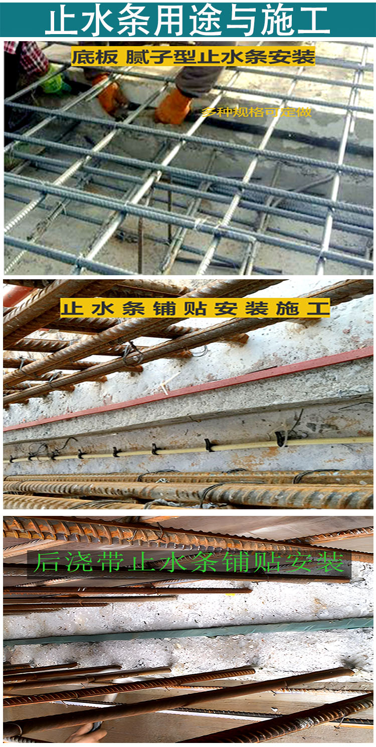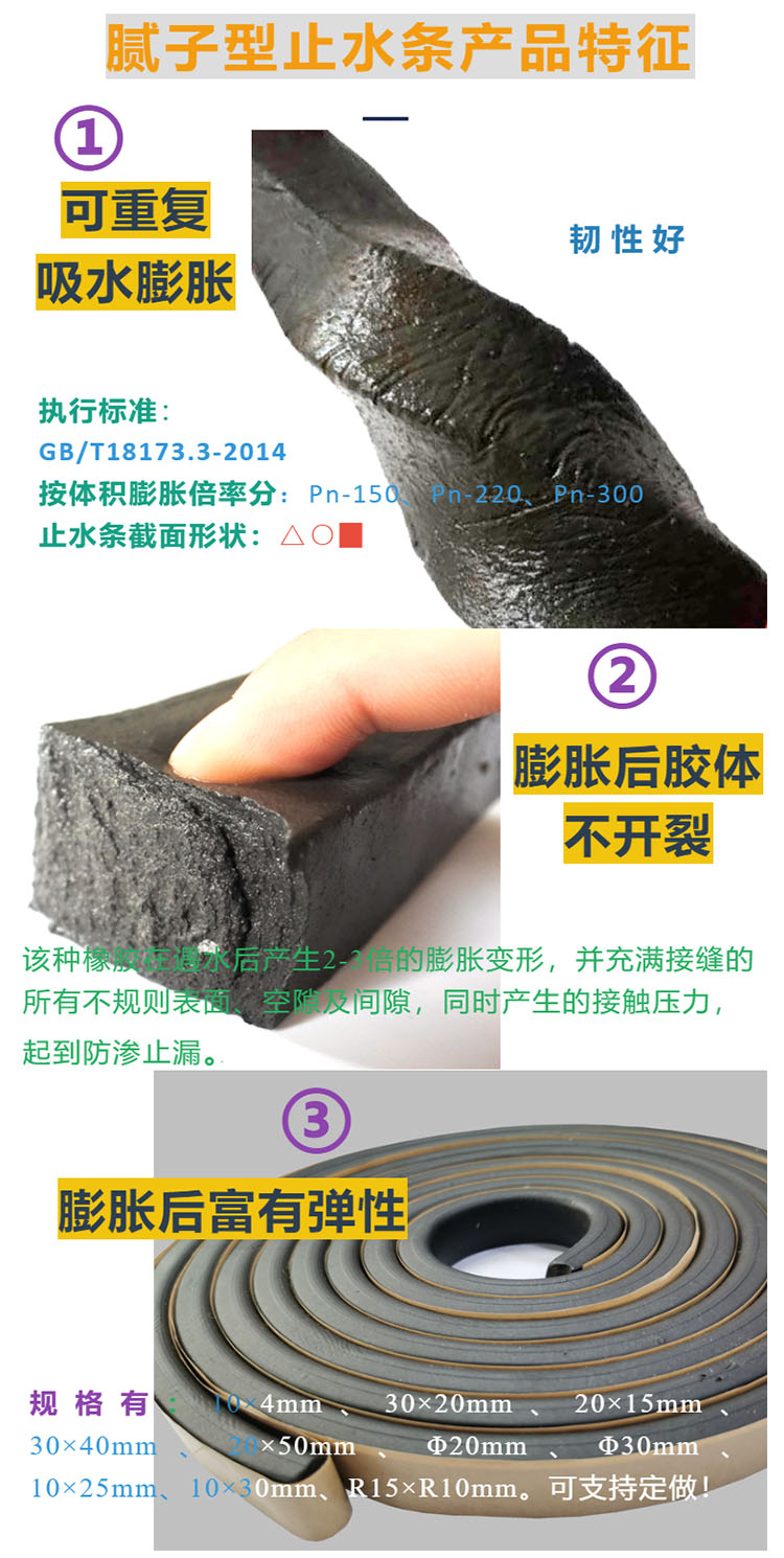 腻子型膨胀橡胶 后浇带遇水膨胀止水条 膨胀3倍 弹性接缝止水材料,腻子型膨胀橡胶条具有遇水膨胀的特性,在材料膨胀范围以内仍能起到止水作用,起到遇水自行膨胀以水止水。后浇带墙体出现渗漏时,可采用安装遇水膨胀止水条来止渗漏水。使用小锤子、钢钎凿除后浇带内松动的商砼,清扫干净,不要破坏钢筋。主要是要剔除后浇带内的支设钢筋、钢丝网、模板、木方处杂物、灰浆。