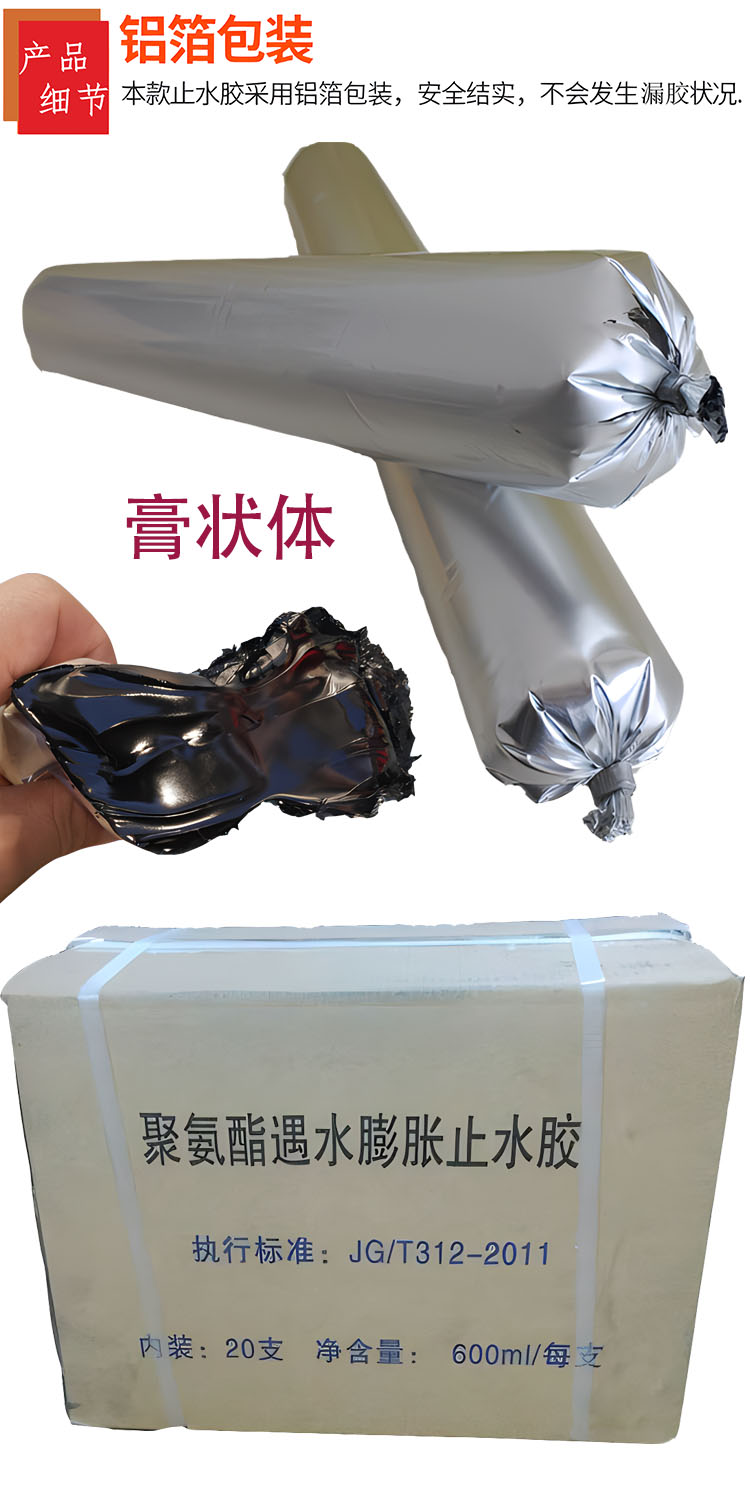 预埋构件嵌填缝聚氨酯止水胶,单组份缓膨型,遇水膨胀密封膏。单组份聚氨酯膨胀密封胶又叫缓膨型止水胶,因为它是单组份黑色膏状物,固化后具有遇水体积膨胀和膨胀后又具有橡胶弹性的双重止水功能。抗水压≥1.5Mpa。可以湿气固化,固化时间取决于环境温度和湿度。温度越高或湿气越大,固化时间越短。