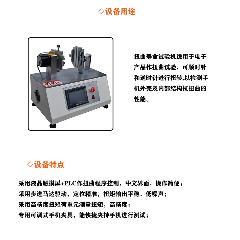 适用于电子产品作扭曲试验,可顺时针和逆时针进行扭转,以检测手机外壳及内部结构抗扭曲的性能。 |
