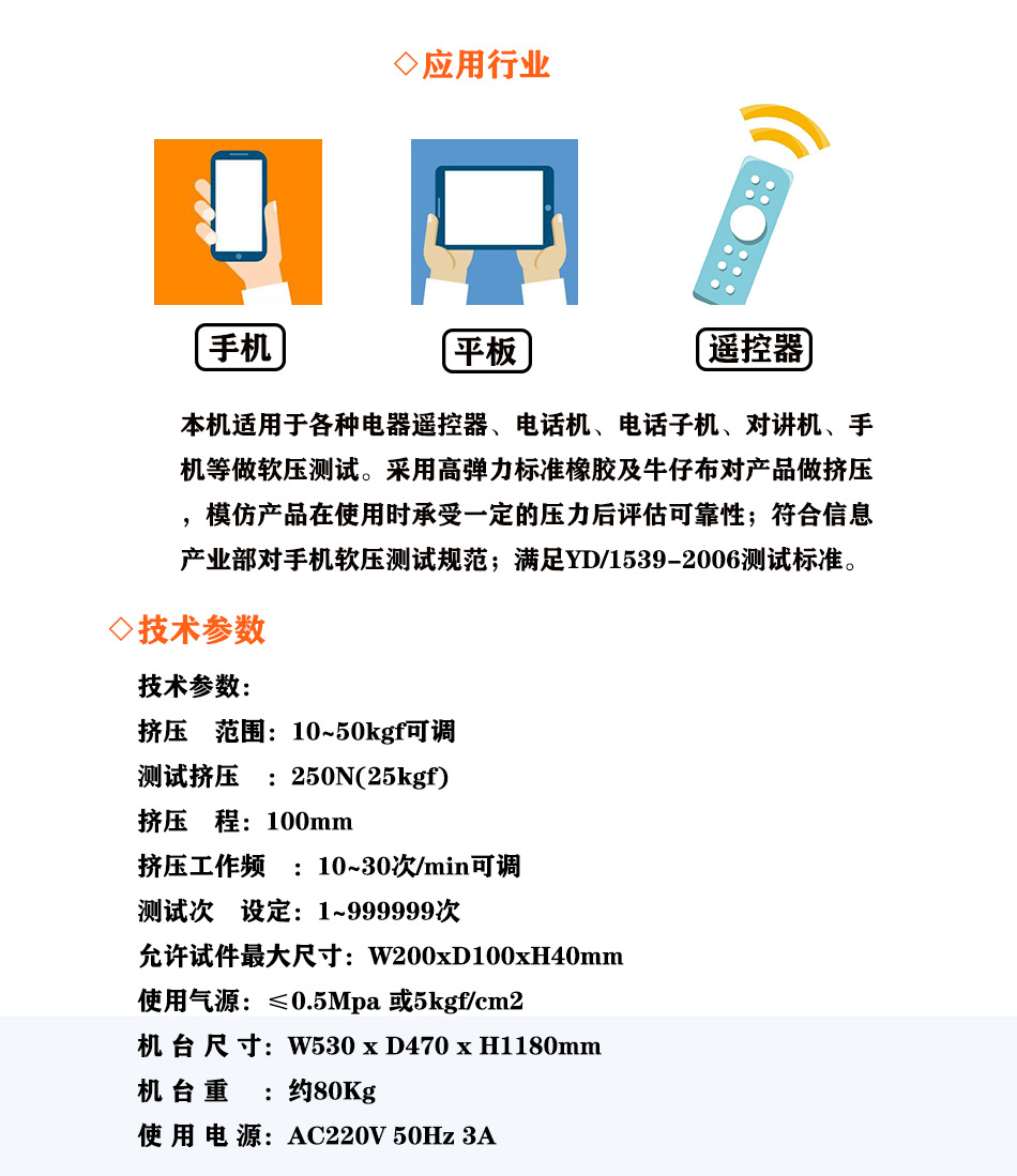 适用于各种电器遥控器、电话机、电话子机、对讲机、手机、平板等做软压测试。 |