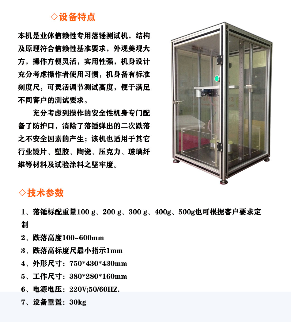 落锤冲击试验机用于手机、塑胶、陶瓷、亚克力、玻璃、镜片、五金等产品的耐冲击强度测试。 |