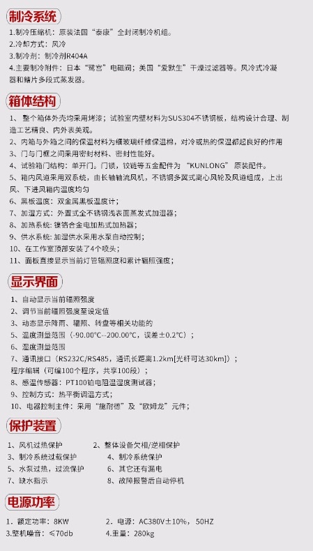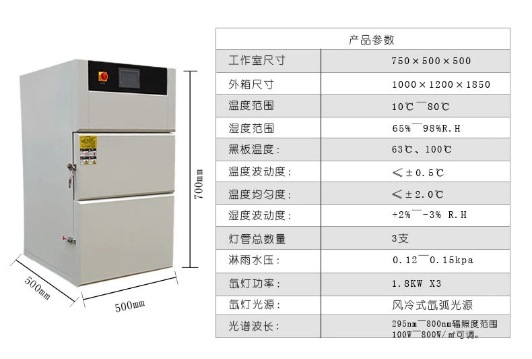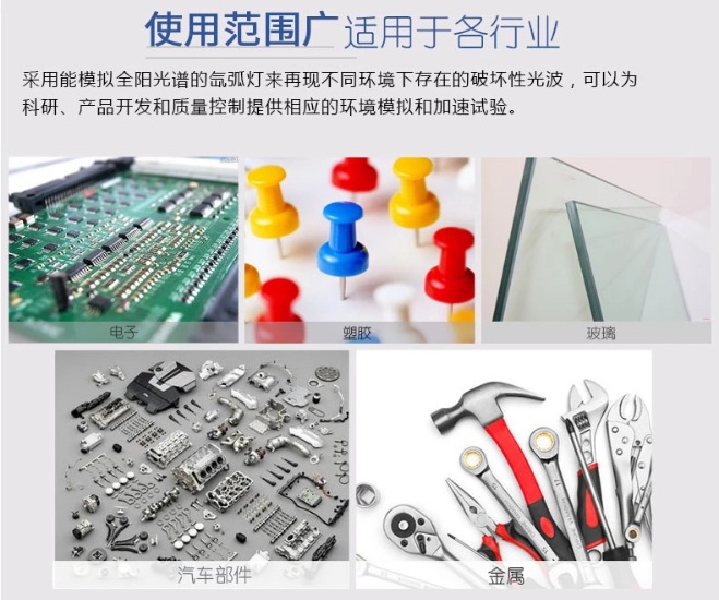 通过材料试样暴露在氙弧灯的光照及热辐射下进行老化试验.来评价在高温光源作用下某些材料的耐光、耐候性能.主要用于汽车、涂料、橡胶、塑胶、颜料、粘合剂、织物等. |
