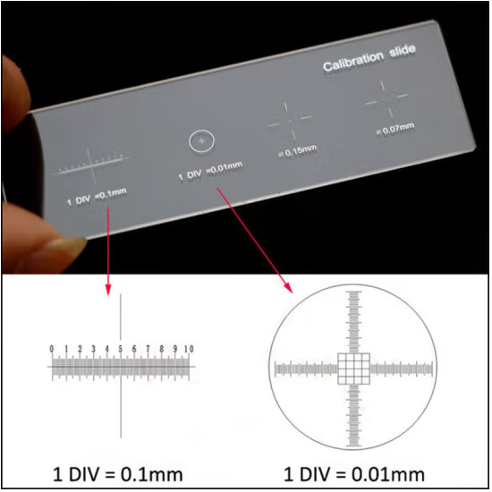 物镜测微尺是一标淮刻尺,其尺度总长为1mm,分为100等分,每一分度值为0.01mm。