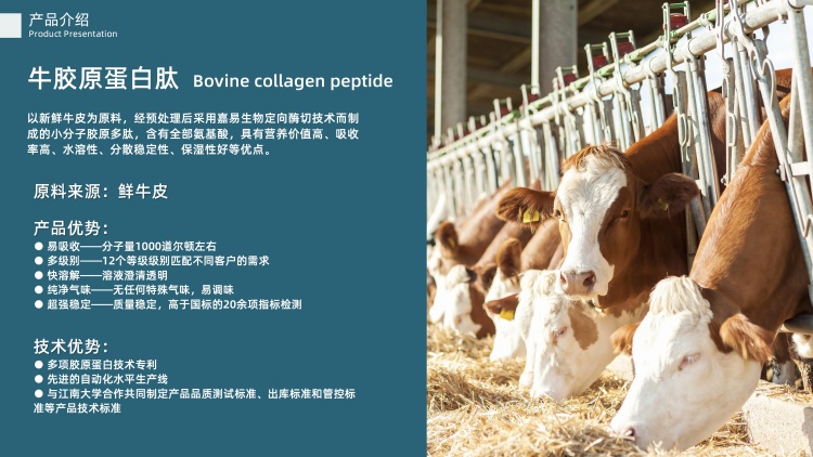 以新鲜牛皮为原料,经预处理后采用嘉易生物定向酶切技术而制成的小分子胶原多肽,含有全部氨基酸,具有营养价值高、吸收率高、水溶性、分散稳定性、保湿性好等优点。