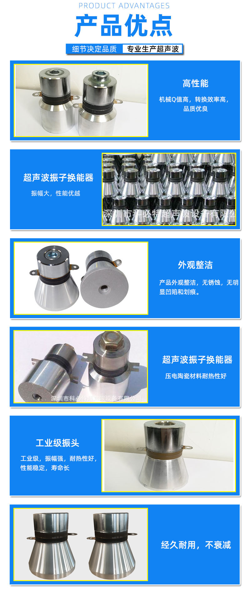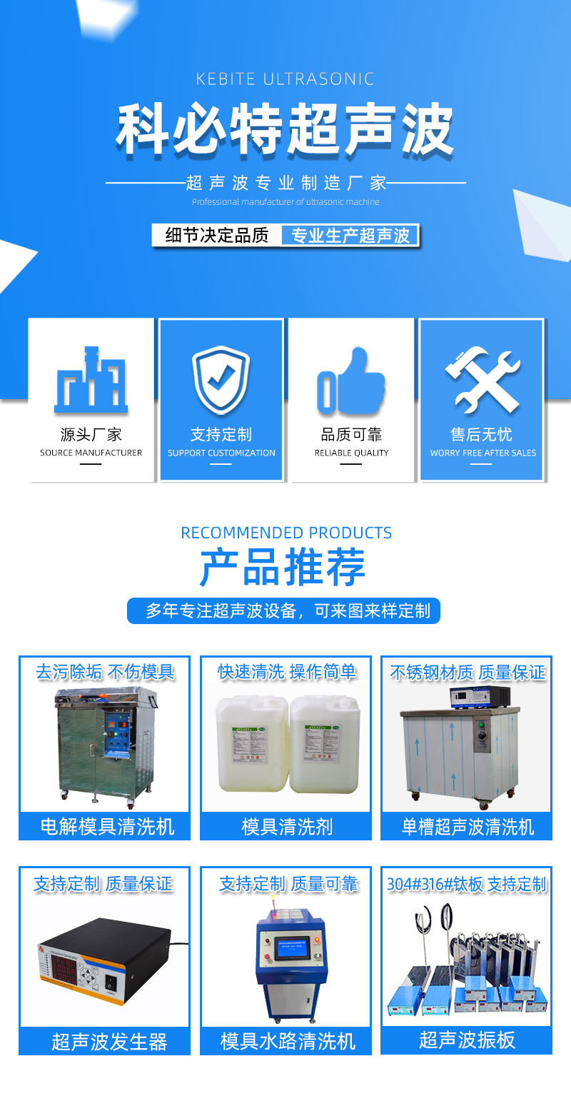 | 深圳市科必特超声波设备有限公司位于深圳市沙井镇,与松岗镇、福永镇近邻,宝安大道与107国道交汇处,与广深高速公路近在咫尺,距深圳机场五分钟的路程,环境优美,交通便利。深圳市科必特超声波设备公司(简称“科必特”)成立于2009年,位于深圳市沙井镇,是一家生产、研发、销售为一体的超声波机械设备有限公司。目前主要产品有:超声波清洗设备、超声波清洗机、超声波非标清洗线、强力聚焦式清洗机、电解超声波清洗机、模具清新剂、模具洗净液、电镀厂专用超声波震板(振板)、超声波焊接机、超声波模具、电镀生产线设备、电镀电源、点焊机、高周波、工业冷水机、工业纯水机、以及非标自动化设备二十几个系列,二百多个品种产品等。公司目前旗下有员工20人,占地面积1000平米 ,年产销额约300万元。公司一贯坚持“用户至上,优良服务,信守合同”的宗旨,凭借着高质量的产品,良好的信誉,优良的服务,产品销往各地竭诚与国内外商家双赢合作,共同发展,共创辉煌。深圳市科必特超声波设备有限公司的诚信、实力和产品质量获得业界的认可。欢迎各界朋友莅临参观、指导和业务洽谈。