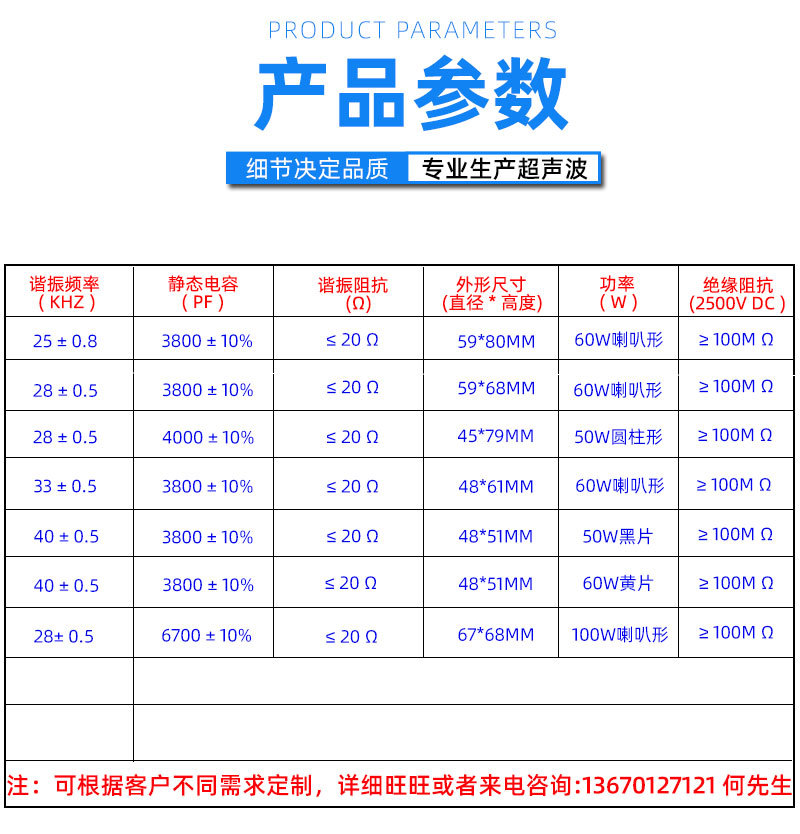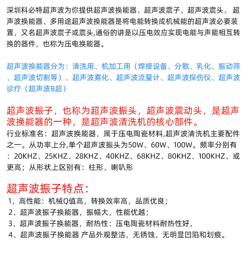 品牌科必特超声用途半导体行业工作方式超声波清洗重量50外形尺寸900*700*850温度控制范围0~100电压220V/380槽数2超声清洗频率28内槽尺寸批发超声波震子 超声波换能厂家 批发超声波换能 NTK超声波震荡子600*500*400类型超声波清洗机加热功率6震子数20时间控制范围0~100产地广东深圳尺寸600*500*400容量120适用场景工业 电镀频率28总功率12视频展示商品描述