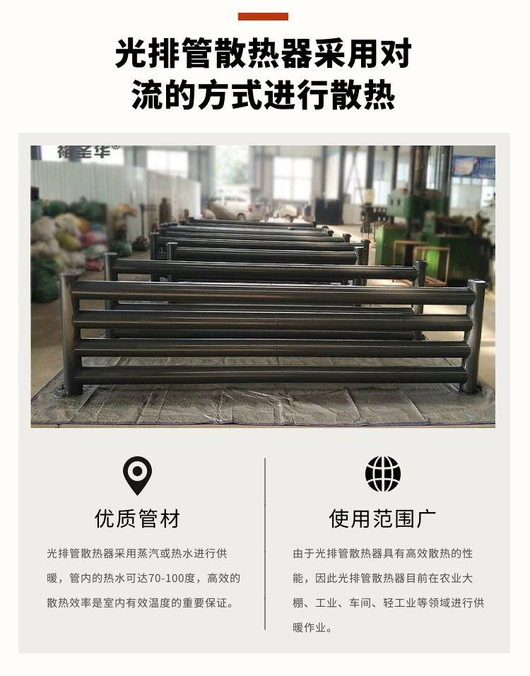 蒸汽光排管暖气片是蒸汽光排管散热器的俗称,它利用蒸汽进行传热。蒸汽光排管暖气片是为了替代大型场所的传统供暖设备所新出现的散热器,他利用自身高效的散热系统,进行大面积的供暖。