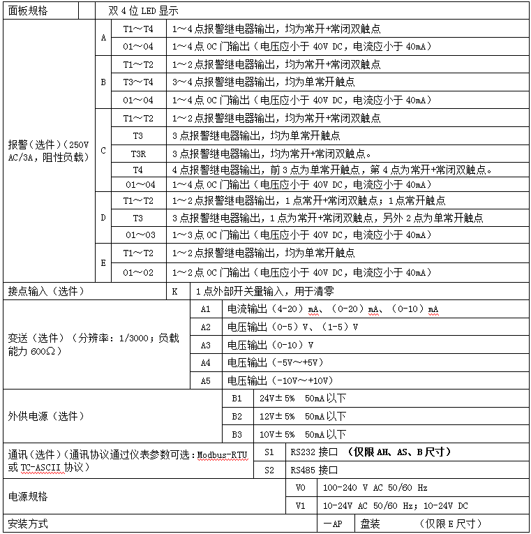l 报警选择T3R或T4时,不能选择外供电源;变送输出和通讯只能二选一,且通讯只能选择 RS485方式(即S2)