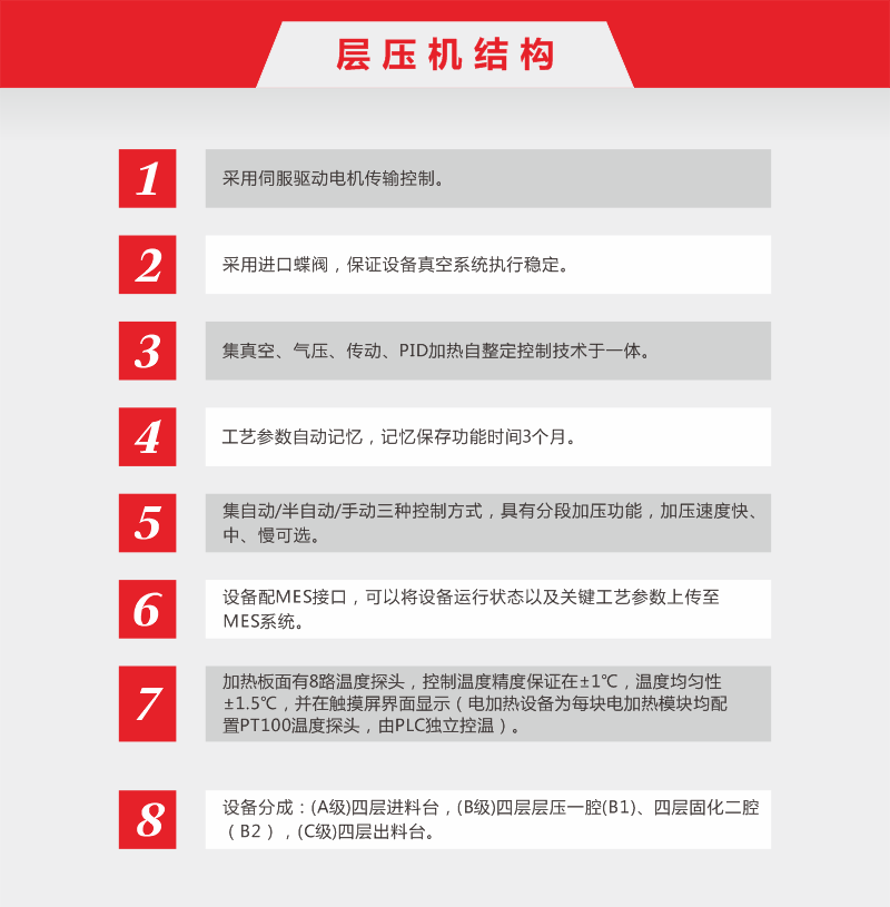 本设备是一款高精度、高自动化的四层双腔光伏组件层压封装系统。其核心结构采用伺服驱动电机进行传输控制,运行平稳。真空系统配置进口蝶阀,确保抽真空与破空过程快速稳定。温控系统集成了PID加热自整定技术,通过分布于加热板面的多路高精度探头(控制精度±1℃,均匀性±1.5℃)实现热场管理。设备具备自动、半自动、手动三种控制模式,并拥有分段加压功能,加压速度可调。整线设计为A级(四层进料)、B级(B1层压腔与B2固化腔)、C级(四层出料)布局,效率高。设备标配MES系统接口,可实现工艺数据追溯与设备状态监控。