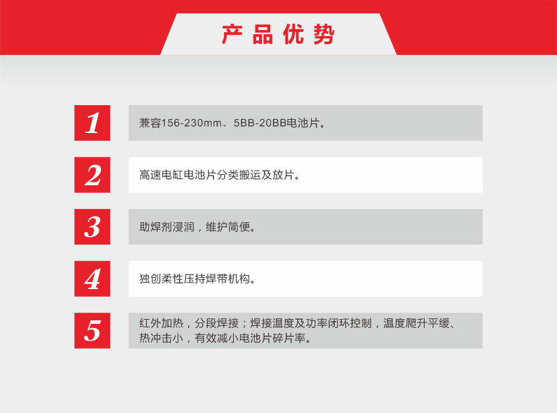 本设备的核心优势在于高效、可靠与的焊接质量。其设计产能高达每小时1200片(半片),能显著提升产线整体输出效率。得益于的温控与柔性压持技术,设备能将电池片的破片率有效控制在3‰以下,大幅降低A级片的加工损耗,直接节约生产成本。红外分段焊接工艺确保了焊点牢固、导电性能优异,串EL检测则提供了可靠的质量保障。广泛的尺寸与电池类型兼容性,使设备能够灵活适应快速变化的市场与技术需求,减少客户因产品迭代导致的设备更新投入。此外,其结构稳定,额定功率为13KW,在保证高性能的同时兼顾了能耗经济性。