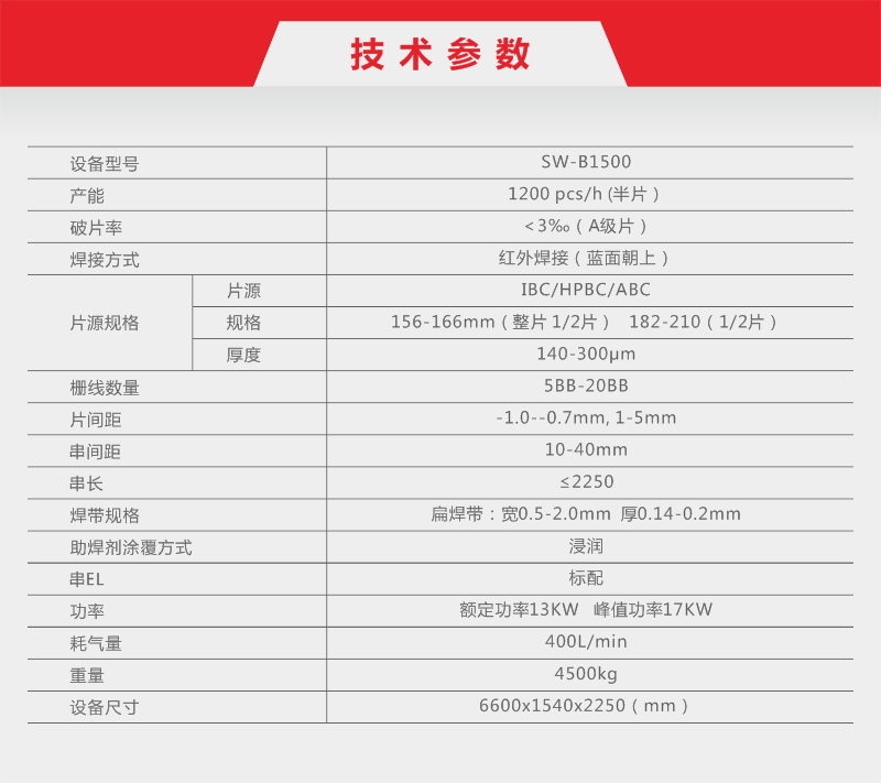 SW-B1500是一款专为高效晶硅电池组件生产而设计的全自动串焊机,其核心技术特点突出。设备采用先进的高速电缸驱动系统,实现电池片的、快速分类、搬运与放置,为高节拍生产奠定基础。其焊接系统集成了红外加热与分段焊接技术,结合焊接温度与功率的实时闭环控制,确保热量施加平缓均匀,显著降低热冲击。的柔性压持焊带机构,能自适应地稳定压合各类焊带。在工艺兼容性上,设备可处理156mm至230mm的电池片,支持从5BB到20BB的多种栅线设计,并专为IBC、HPBC、ABC等无主栅或特殊结构电池片优化。助焊剂采用浸润式涂覆,确保覆盖均匀且维护简便。设备标配串EL测试功能,实时监控焊接质量。