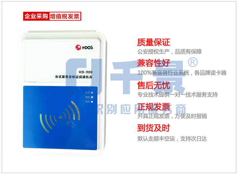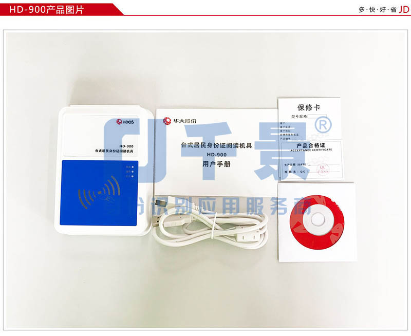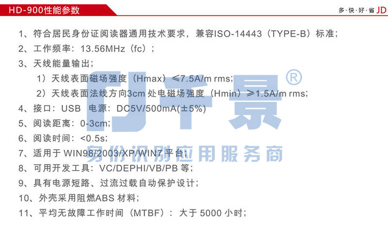 3.HD-900台式居民身份证阅读机具符合 ISO-14443(TYPE-B)标准。