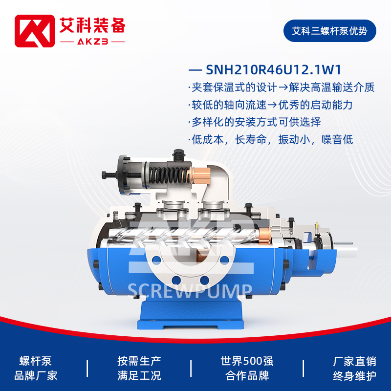 黄山艾科装备科技有限公司生产的SNH系列三螺杆泵是一款中压自吸式容积定量泵,压力范围≤4Mpa(40bar),适于输送温度≤180℃、粘度1-15000cSt、流量范围10-10000L/min(600m3/h)。适用于输送具有润滑性和适当粘度,不含磨损性固体颗粒和腐蚀性的所有流体性介质。适用于钢铁冶金厂、矿山破碎机器、水泥厂、化工厂、油田开采、油罐区、发电厂、海事船舶、橡胶轮胎等行业中用作润滑油泵(主机润滑油泵、紧急润滑油泵、辅助润滑油泵、十字头润滑油泵)、液压油泵、顶轴油泵、密封油泵、输送泵、集输泵、控制油泵、集输增压泵、供油泵、卸油泵、以及芳烃油泵等……