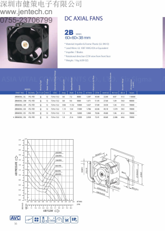 健策电子一级代理AVC散热风扇, 2B系列此款风机尺寸:60*60*38mm运转电压分:12V,温度范围:-20-+60度和-20-+70度 寿命均达到120000H以上,可定制轴承系统、功能信号(FG测速信号、RD报警信号、pwm调速信号、温控信号、防水功能)
