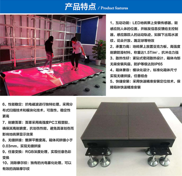感应LED地面显示屏系统工作稳定可靠,抗干扰能力强,连续工作72小时以上,控制系统软件操作界面人性化设计,操作简单。广泛适用于用于机场、车站、展馆、交易厅、酒店、商场、超市、酒吧体育馆、机关、税务、金融、电力、电信、移动通信大型体育场馆、火车候车室、电视节目直播现场、展览场馆、演艺中心、娱乐场所、大型文艺晚会现场、演唱会现场等