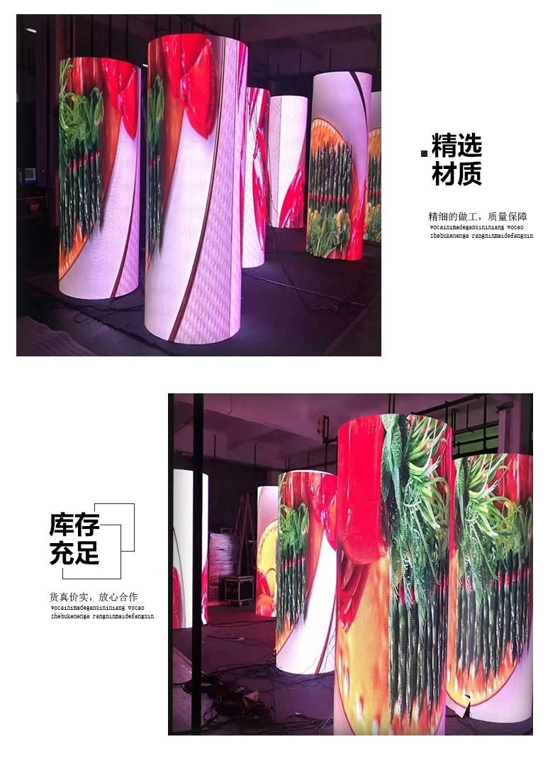 四维鑫圆柱led屏产品特点:1.采用柜架型设计、拆装方便、可靠,易于维护;应用于各大型娱乐场所及大型活动场合;2.利用RGB灯珠封装,顺次排列,均匀分布在单元板上,构成显示屏;3.均匀性好,具有很出色的发光一致性,效果优良;4.显示电视、DVD、动画等任何可以在电脑上显示的内容,具有亮度手动、自动调节,多画面分割等多种编辑功能;5.变化多端的色彩,256级灰度、亮度可达7000CD以上;色彩更丰富,更亮丽!稳定性能高(无抖动、闪烁、接插件松脱的现象);6.真正音乐控制、通过麦克风可根据DJ打碟的现场音乐控制LED彩显墙的变化,与音乐实现无缝连接、让声与光容于一体;7.适用于电视台演播大厅、大剧院、大型娱乐场所及夜间户外演出舞台背景,规格也可依用户需求量身设计订做。
