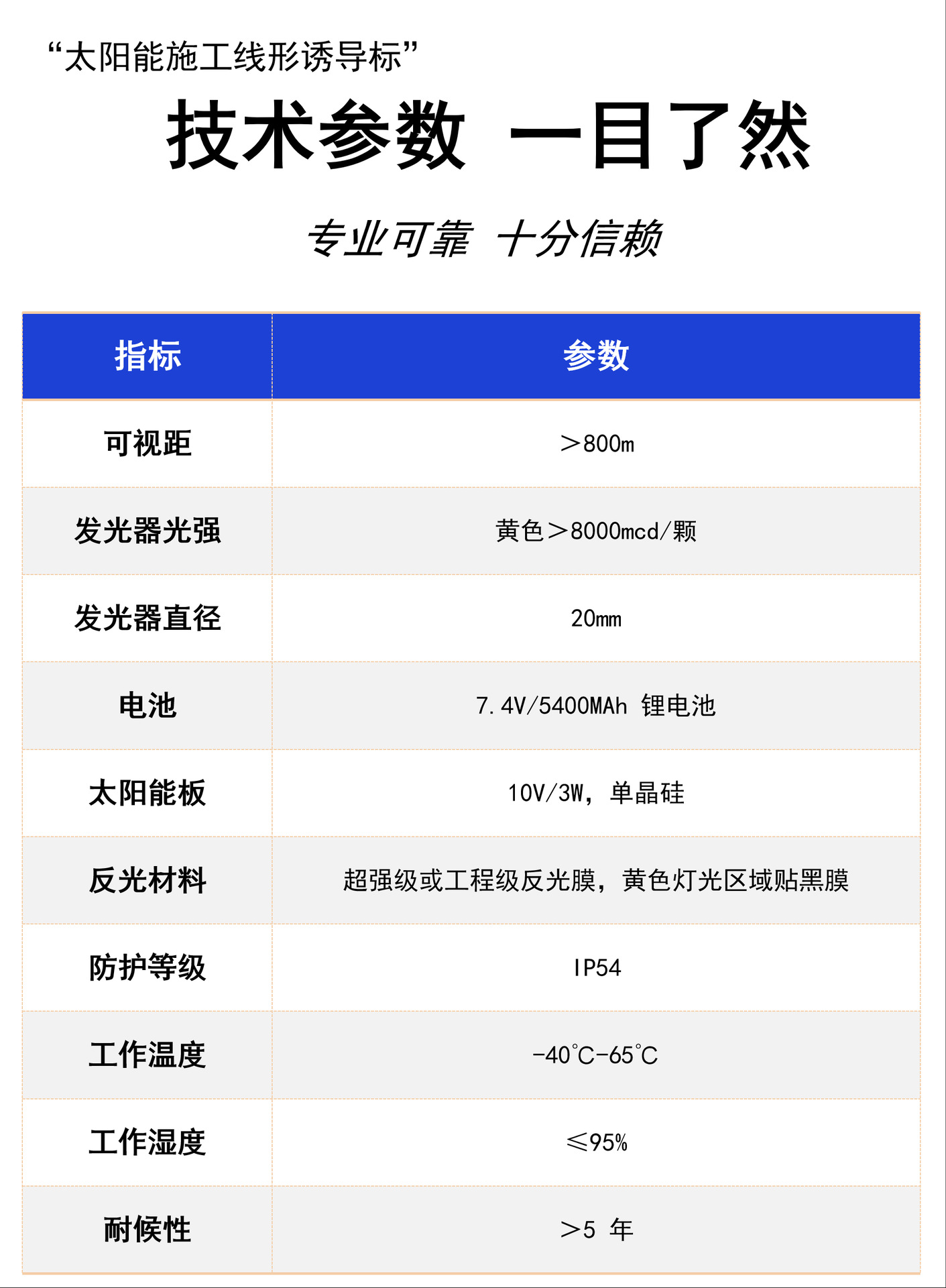 太阳能施工线形诱导标是我司发明的专利产品,其应用了发光、反光原理,由太阳能板、控制电路、发光器主件、反光材料等设备组成 。通常放置在道路施工、养护路段,以警示行人或车辆,达到减少交通事故的效果。