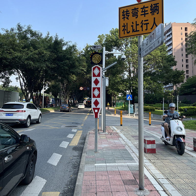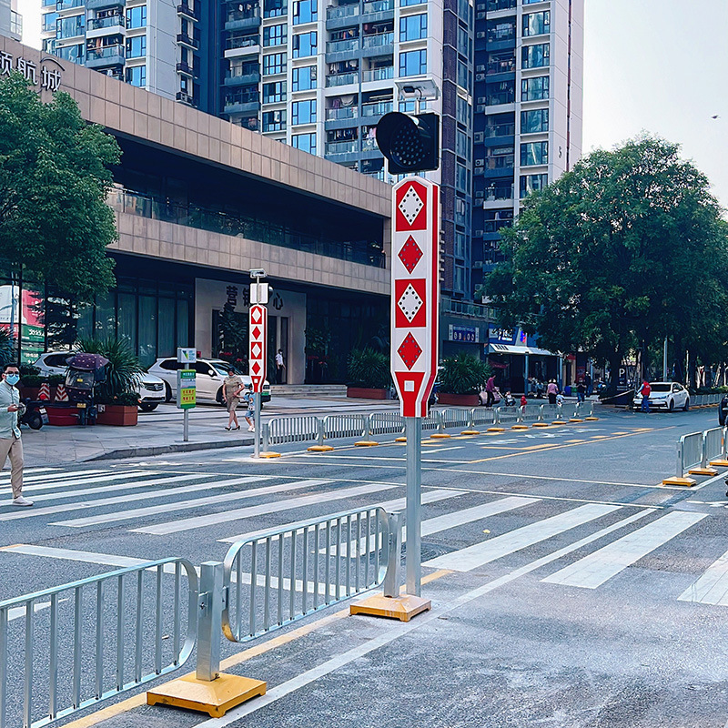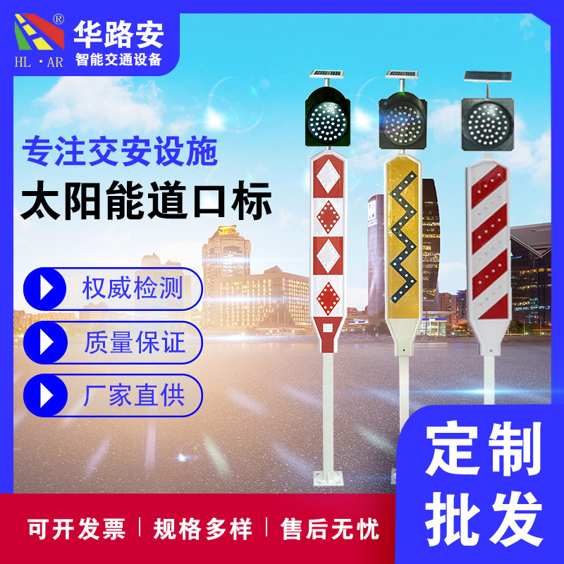 组合式太阳能道口标是我司发明的专利产品,其应用了发光、反光原理,由太阳能板、控制电路、发光器主件、反光材料等设备组成,通常安装在一些交通要道、道路分流、合流处,学校门口、人行横道及一些标志不明显的危险地段。以警示行人或车辆,达到减少交通事故的效果。