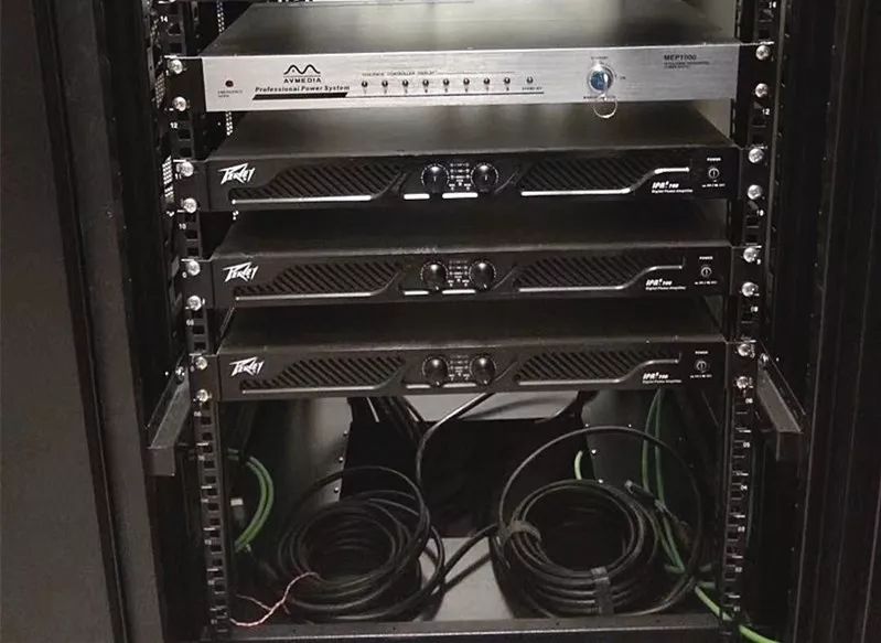 AV1000M-Ⅱ加配DANTE卡作为会议室的音视频控制管理中心,音箱使用了2只Impulse 2652R、4只PHR 630Ⅱ,对应功放用了各一台IPR2 700与IPR2 1000,一台MEP 1000作为电源管理器。