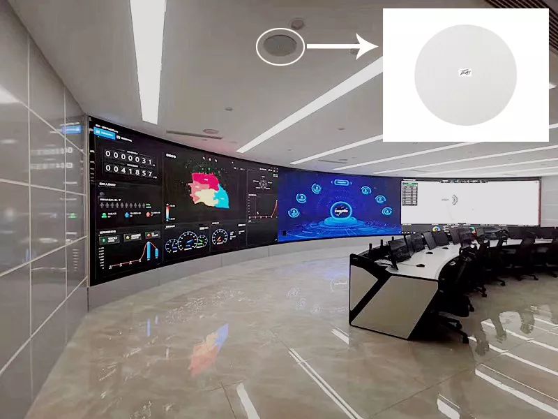 中心指挥大厅提供大屏幕综合信息显示,记录、存储和处理各种信息,响应紧急事件预警,并提供跟踪定位、监听录音、视频采集、场景上传和远程控制等处理措施。在此,拥有一个声场均匀、语音清晰、音质优美、运行稳定的扩声系统显得尤为关键。埃威姆技术团队通过对现场环境的勘察,决定选用一台AV3000M作为音视频控制管理中心,另采用8只PHR 630II吸顶音箱、2台IPR2 700功放和1台MEP1000电源管理器,组成中心指挥大厅扩声系统,保证了大厅内每个角落的声场听觉均匀,不会出现失真、偏音、混音、回响等不良音响效果,让指挥中心及人员‘声声必达’,从而提高声讯传达和办事效率。