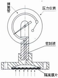 隔膜式压力表结构原理隔膜在被测介质压力作用下产生变形,密封液被压,形成一个相当于P的压力,传导至压力仪表,显示被测介质压力值。