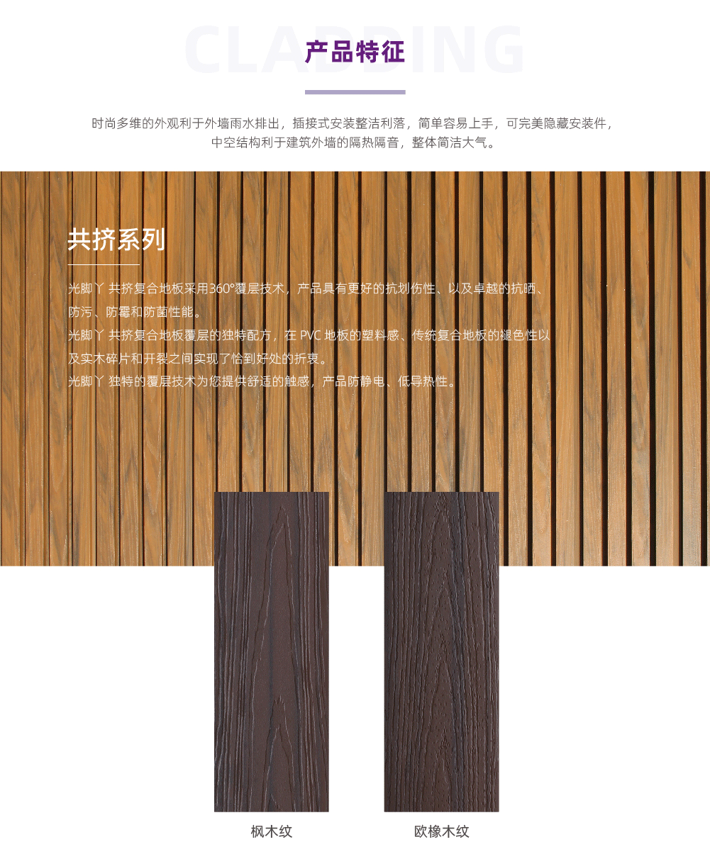户外墙板CO-09,第二代共挤高分子材料360度全包覆,时尚多维的外观利于外墙雨水排出,插接式安装整洁利落,简单容易上手,可完美隐藏安装件,