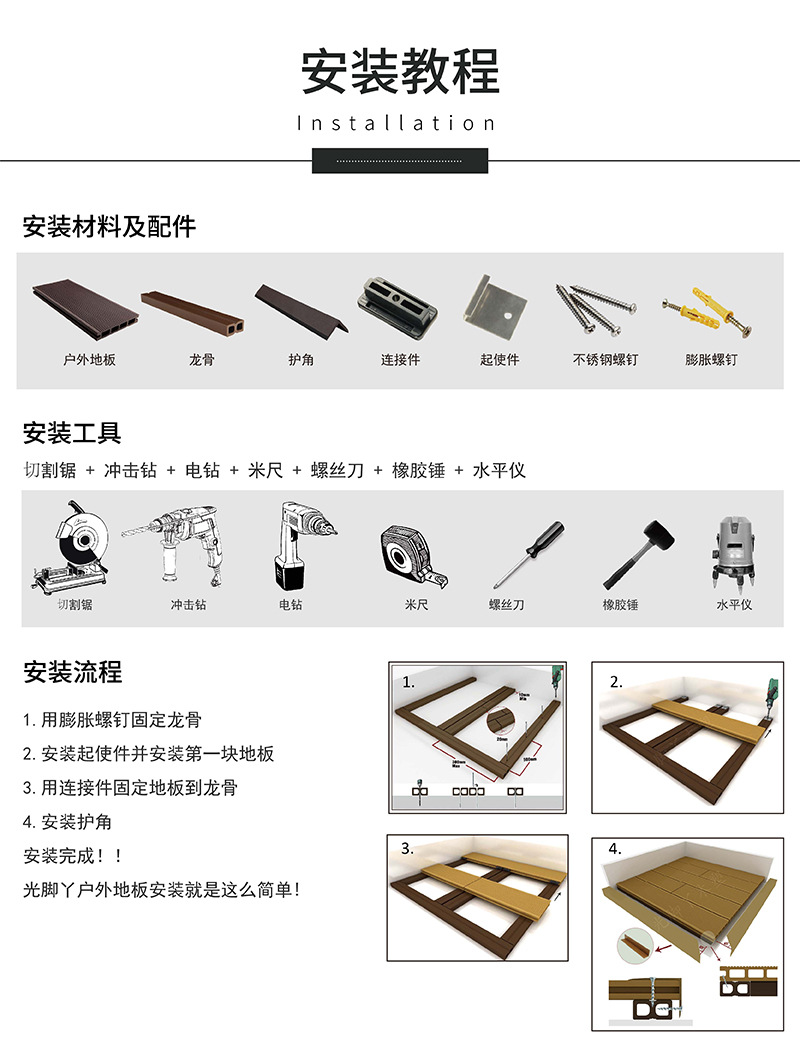 光脚丫花园地板潜心专注户外建材的设计、研发和生产,在户外地板板块,针对不同的工程应用环境有针对性的设计研发。现光脚丫户外地板产品可适用于在阳台、露台、别墅庭院、天台、室外泳池、公园道路、小区绿化装饰、广场、步行街等,覆盖我们生活的方方面面。